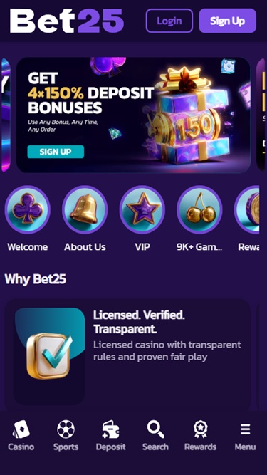 Bet25成立于2025年,是一家大型在线赌场,接受来自德国、奥地利、芬兰、加拿大和新西兰的玩家,并邀请他们探索其丰富的赌场游戏和体育博彩选项。该品牌提供数千款在线老虎机、真人荷官游戏、桌面游戏和即时投注游戏,并为玩家提供各种促销活动和奖励。