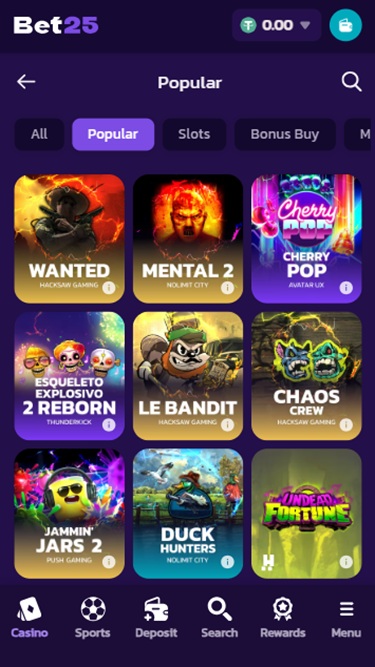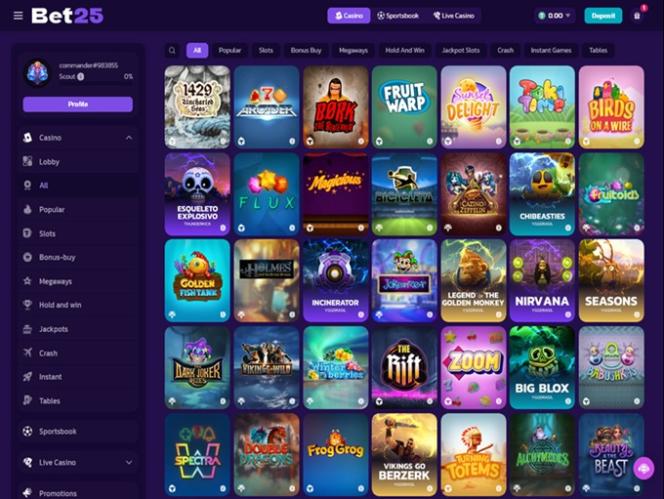 无论您是哪种类型的玩家,Bet25 都能轻松满足您的所有游戏需求。该品牌拥有种类繁多的精彩赌场游戏,并且其团队已获得超过 90 家软件供应商的授权,其中大多数供应商都被认为是业内顶尖的。