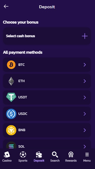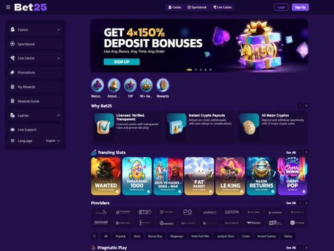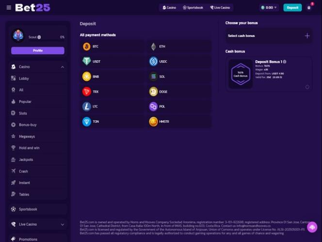 Bet25 主要是一家以加密货币为导向的在线赌场,您可以使用多种加密货币进行存款和取款,包括比特币、比特币现金、狗狗币、以太坊、莱特币、索拉纳、 Toncoin 、 Tron 、USD Coin 和泰达币。