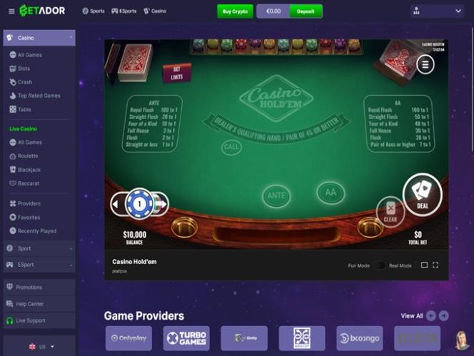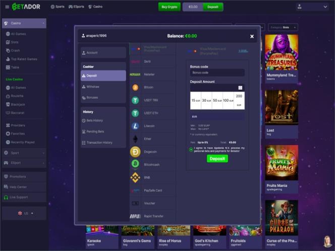 Betador Casino 支持各种流行的加密货币和加密支付选项,但它也包括传统银行方式,如借记卡和信用卡、知名的电子钱包和其他在线支付系统。