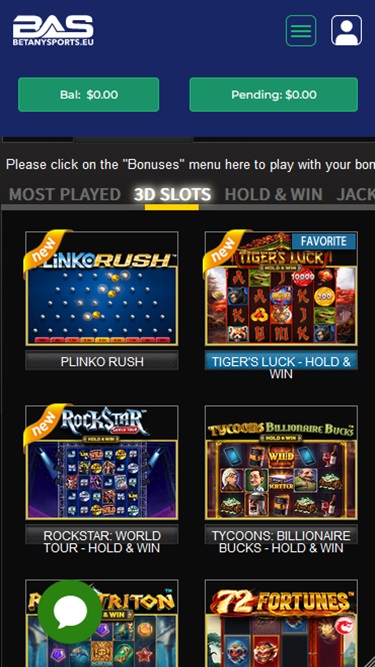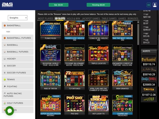 BetAnySports 提供丰富的老虎机游戏,其中包括大量视频老虎机和大量经典的 3 卷轴游戏。此外,还提供移动老虎机游戏,以及一些提供高额现金奖励的累积奖金。