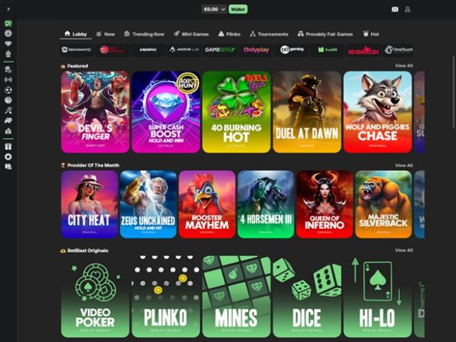 当然,您还可以玩许多即时崩溃游戏,如Aviator、Tap the Pot、Plinko、Super Beto Crash、Gravity Plinko、Diamond Digger、Plinko Rush、Courier Sweeper、Super Sixers Xtreme 和 Jet X。Betblast Casino 还提供大量原创游戏,如Video Poker、Crash、Mines、Dice、HiLo、Diamonds等。