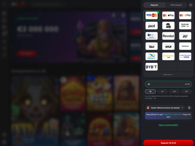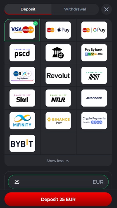 BetBona 提供多种支付方式,方便您存取款,包括Visa 、Mastercard、银行电汇、Jeton、 Skrill 、 Neteller 、 Google Pay 、 Apple Pay和 Revolut。此外,该平台还接受多种加密货币,例如比特币、比特币现金、狗狗币、以太坊、莱特币、 Solana 、 Tron 、 USD Coin 、Tether 和Ripple 。