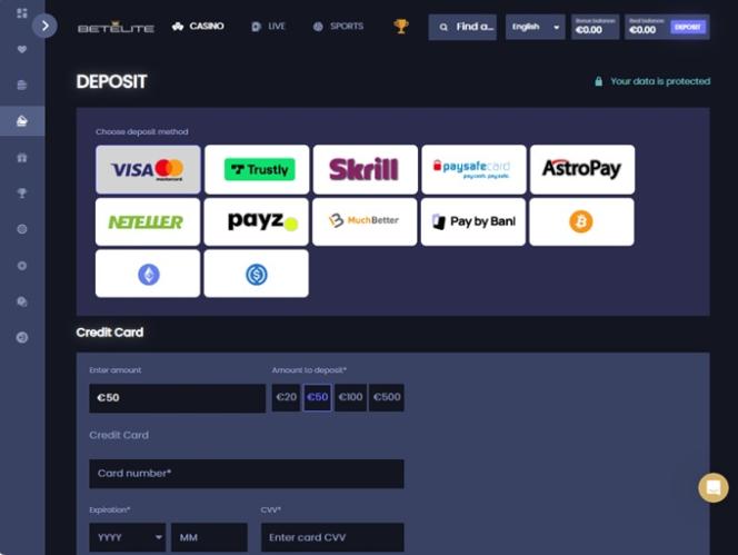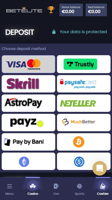 BetElite 为玩家提供多种存款和取款支付方式。传统支付方式包括Visa 、 Mastercard 、 Apple Pay 、PayPal、 Paysafecard 、 MuchBetter 、 Skrill 、 Neteller 、银行电汇、 Payz和Trustly 。现代支付方式包括比特币、以太坊和USD Coin等加密货币。