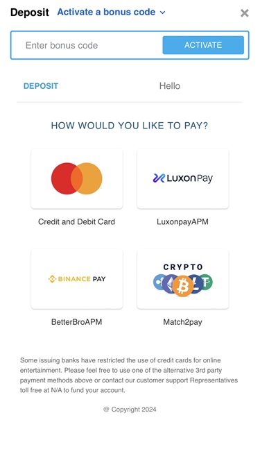 我们很高兴看到该品牌为玩家提供了非常广泛的支付选项。首先,我们提供Visa 、 Mastercard 、 AstroPay 、 Jeton和Interac等传统支付方式。此外,我们还接受加密货币存款和取款,可用货币包括比特币、以太坊、莱特币、泰达币、波场币和瑞波币。
