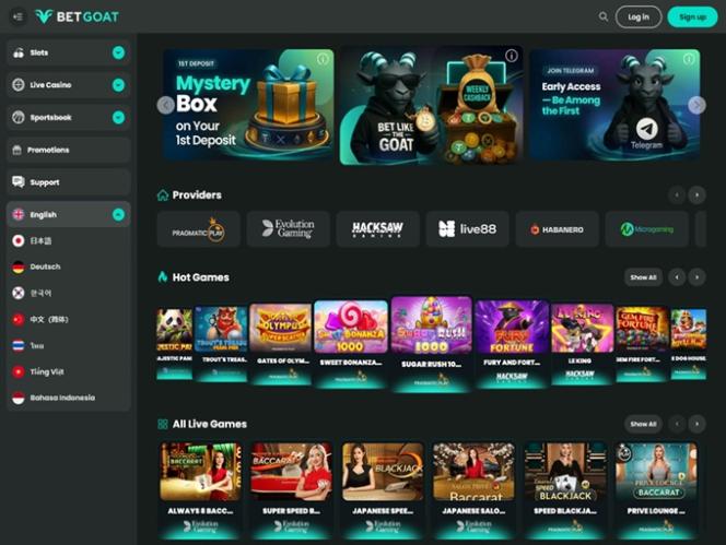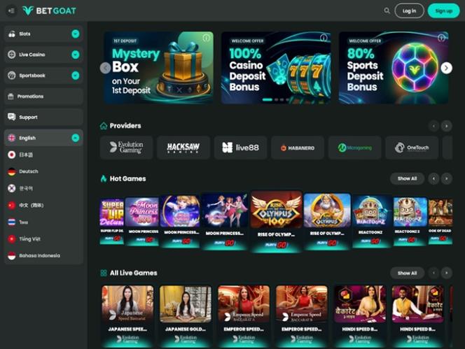 BETGOAT 是一个功能全面的博彩网站,主要面向亚洲玩家,同时也欢迎来自欧洲和全球其他地区的玩家。该品牌提供全面的赌场游戏阵容,包括在线老虎机、真人荷官、桌面游戏和速成游戏,同时还提供同样令人印象深刻的体育博彩选项、促销活动和奖金。