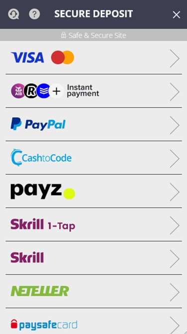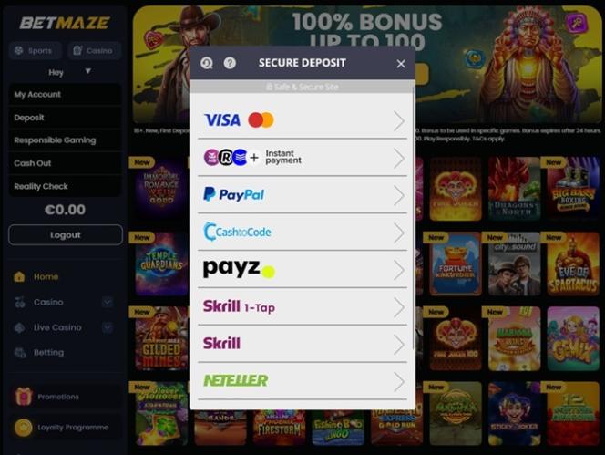 Betmaze 提供多种传统支付方式,包括信用卡和借记卡、Skrill 和 Neteller 等电子钱包以及其他选择。如果您有兴趣使用加密货币付款,请注意,在撰写本文时,加密货币银行服务尚不可用。