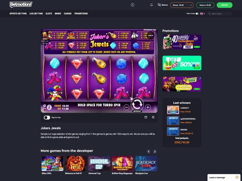 Betmotion 赌场由 Microgaming, Net Entertainment, BetSoft, 1x2gaming, Big Time Gaming, Espresso Games, Evolution Gaming, Ezugi, Habanero Systems, iSoftBet, lightningboxgames, Play'n GO, Rabcat, Vivo Gaming, Yggdrasil, Wazdan, GameArt, Betgames, Booming Games, Pragmatic Play, Booongo, Spinomenal, Red Rake Gaming, Skillzzgaming, Fugaso, Skywind, Spinmatic, Triple Edge Studios, Northern Lights Gaming, Stormcraft Studios, Switch Studios, Electric Elephant Games, Pocket Games Soft, All41 Studios, Gluck Games, NetGame Entertainment, Gameburger Studios, Slot Factory, Neon Valley Studios, Golden Rock Studios, ThunderSpin, SpinPlay Games, 7Mojos, SmartSoft Gaming, Real Dealer Studios, Buck Stakes Entertainment, Caleta Gaming, Games Global, Amusnet Interactive, 2by2 Gaming, Ainsworth, Blueprint Gaming, Leander Games, Merkur Gaming, Reel Time Gaming, MGA, Old Skool Studios, Foxium, Zitro, Just For The Win, Reflex Gaming, PearFiction Studios, Wild Streak Gaming, Slingshot Studios, Fortune Factory Studios, 4ThePlayer, AvatarUX, Crazy Tooth Studio, High 5 Games, ReelPlay, Alchemy Gaming, BB Games, Snowborn Games, Hacksaw Gaming, Gold Coin Studios, Bang Bang Games, Copacabana Gaming, Gamzix, Triple Cherry, Peter And Sons, Aurum Signature Studios, Onlyplay, Area Vegas, 3 Oaks Gaming and PopOK Gaming提供支持,拥有丰富的老虎机、桌面游戏和视频扑克游戏库。该赌场提供网页平台和移动端网站,方便在智能手机和平板电脑上畅玩。Baccarat