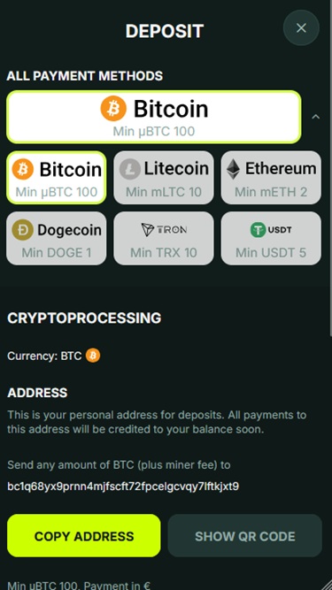 在支付方式方面,玩家可以使用多种选项来管理资金,包括Google Pay 、 Apple Pay和Paysafecard 。该品牌还接受多种加密货币作为有效的支付方式,包括比特币、比特币现金、卡尔达诺、狗狗币、以太坊、莱特币、索拉纳、波场币、美元币、泰达币和瑞波币。