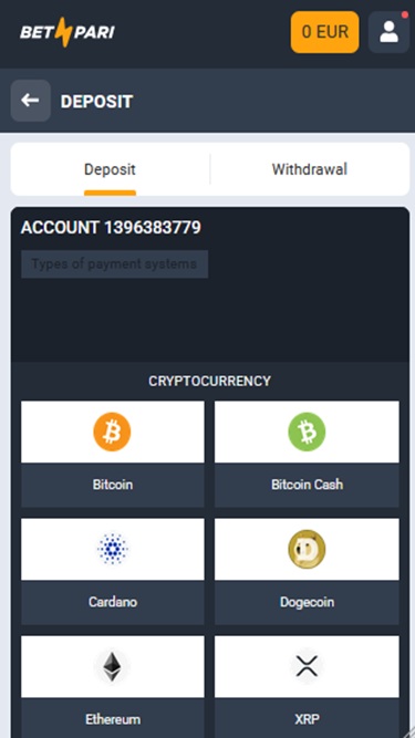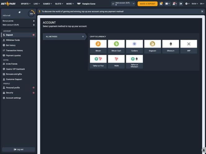 关于支付方式,BetPari 仅接受Visa和Mastercard作为传统银行卡支付,不提供电子钱包、银行电汇或预付卡支付。不过,该品牌接受多种加密货币,包括比特币、比特币现金、狗狗币、卡尔达诺、以太坊、瑞波币、泰达币和波场币。
