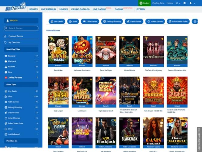 BetPhoenix Casino 由 BetSoft, Visionary iGaming, BGAMING, Mancala Gaming, KA Gaming and Yeebet Gaming提供支持,其游戏可通过基于网络的平台进行玩。