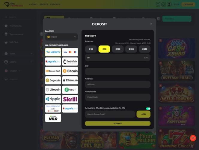 BetPRIMEIRO 是一个大型博彩网站,提供丰富的赌场游戏,包括真钱老虎机、真人荷官、速战速决游戏和桌面游戏,以及丰富的体育博彩选择。该品牌诚邀来自德国、加拿大和爱尔兰的玩家访问其网站,承诺提供全面的游戏体验,包括丰富的游戏种类、丰厚的奖金、激动人心的促销活动以及加密货币支持。