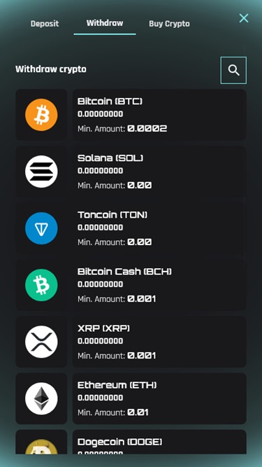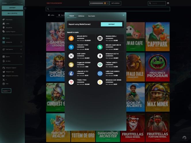 正如我们所提到的,Betrunner Casino 是一个加密货币专属的博彩网站,玩家可以使用多种加密货币进行存取,包括比特币、比特币现金、卡尔达诺、狗狗币、以太坊、 Solana 、泰达币、 Toncoin 、波场币、 USD Coin和瑞波币。还没有加密货币钱包的用户可以使用Visa和万事达卡直接从网站购买加密货币。