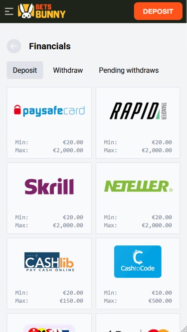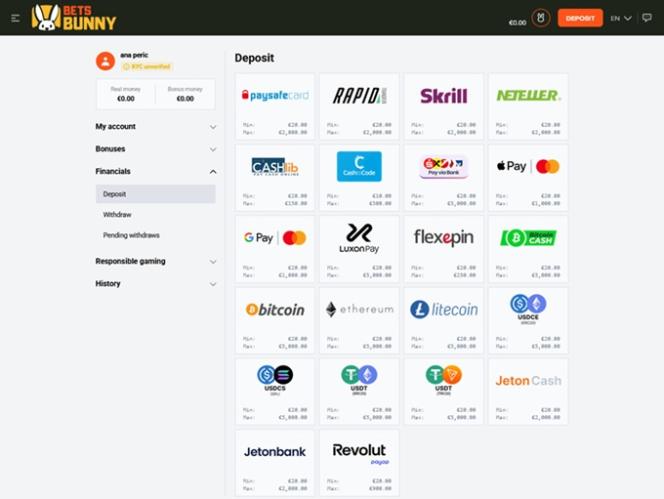 在 Bets Bunny 存取资金简单直接,因为该品牌接受多种付款方式,包括Visa 、 Mastercard 、 Apple Pay 、 Google Pay 、银行电汇、 Skrill 、 Neteller 、 Paysafecard和Flexepin 。此外,玩家可以使用多种加密货币来管理资金,例如比特币、比特币现金、以太坊、莱特币、 USD Coin和Tether 。