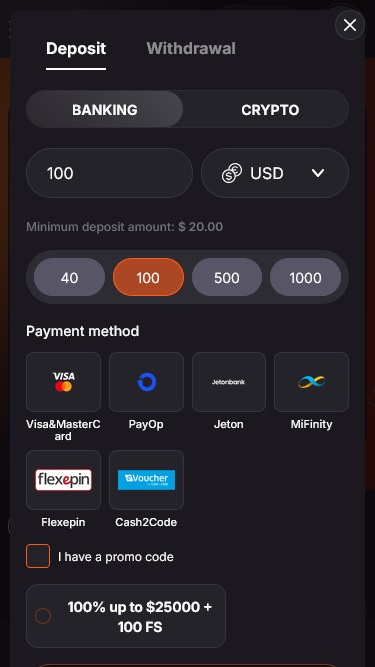 我们提供多种银行服务选项。玩家可以选择使用Visa 、Mastercard、Neosurf、Neteller、Skrill、Jeton、Paysafecard 等热门支付方式。除了这些传统的银行服务选项外,运营商还允许使用加密货币进行存款和取款。