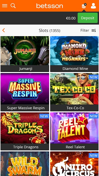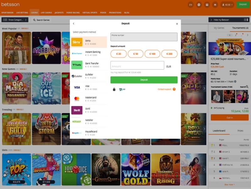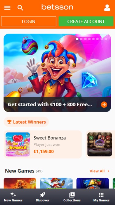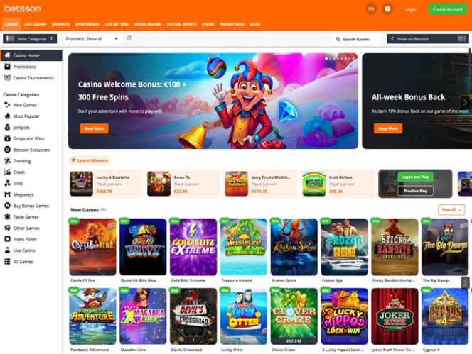 Betsson Casino 由 Microgaming, Playtech, BetSoft, 1x2gaming, Big Time Gaming, ELK Studios, Evolution Gaming, EYECON, Ezugi, Genesis Gaming, Habanero Systems, iSoftBet, lightningboxgames, Novomatic, Oryx, Play'n GO, playson, Quickspin, Rabcat, Relax Gaming, Thunderkick, Yggdrasil, Endorphina, Wazdan, Betgames, Booming Games, Stakelogic, Pragmatic Play, Nolimit City, Felt Gaming, Red Tiger Gaming, Red Rake Gaming, Skillzzgaming, Fantasma Games, FunFair, SYNOT Games, FUGA Gaming, Kalamba, Sigma Gaming, Skywind, Triple Edge Studios, Northern Lights Gaming, Stormcraft Studios, Switch Studios, Electric Elephant Games, Pocket Games Soft, Bulletproof Games, All41 Studios, Gluck Games, Gameburger Studios, Pulse 8 Studios, Neon Valley Studios, Spearhead Studios, SpinPlay Games, Real Dealer Studios, GONG Gaming, Blue Guru Games, Lady Luck Games, On Air Entertainment, Buck Stakes Entertainment, Games Global, Wizard Games, 2by2 Gaming, Ash Gaming, Blueprint Gaming, Greentube, Leander Games, Pariplay, Push Gaming, Inspired Gaming, Genii, Gamomat, RFranco Group, Reel Time Gaming, MGA, Authentic Gaming, Bally Wulff, Iron Dog Studio, Old Skool Studios, Foxium, Just For The Win, The Games Company, Reflex Gaming, MetaGU, PearFiction Studios, Apollo Games, Wild Streak Gaming, Slingshot Studios, Fortune Factory Studios, Jade Rabbit Gaming, Green Jade Games, STHLM Gaming, RubyPlay, 4ThePlayer, AvatarUX, Gamevy, Crazy Tooth Studio, NetGaming, High 5 Games, YoloPlay, ReelPlay, Alchemy Gaming, Rarestone Gaming, Plank Gaming, Vibra Gaming, Aurify Gaming, BB Games, Snowborn Games, Boomerang Studios, Hacksaw Gaming, Max Win Gaming, Gold Coin Studios, Bang Bang Games, Slotmill, Peter And Sons, Absolute Live Gaming, Eurostar Studios, Aurum Signature Studios, Lucksome Gaming, Beter, Religa, Area Vegas, RAW iGaming, Betradar, Apparat Gaming, INO Games, Nailed It! Games, Live 5, Indigo Magic, Live88 and Sneaky Slots提供支持,为赌场游戏库提供了数百款游戏。该网站可通过网页浏览器访问,并兼容桌面和移动设备。