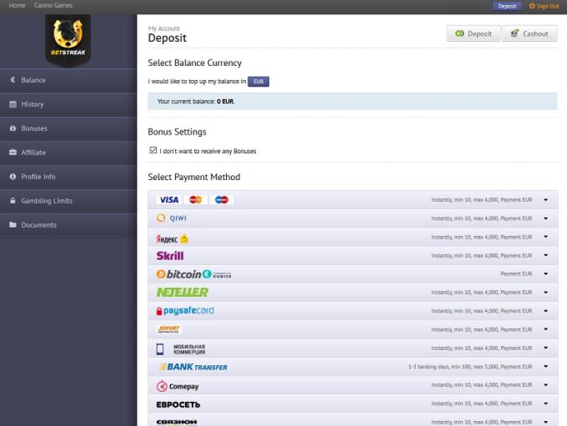 Betstreak 赌场由 BetSoft, Ezugi, iSoftBet, SOFTSWISS, Endorphina and BGAMING提供支持,游戏通过基于网页的即时游戏平台提供,可通过电脑的互联网浏览器加载。该网站也接受移动端游戏,让您通过智能手机或平板电脑进行博彩。