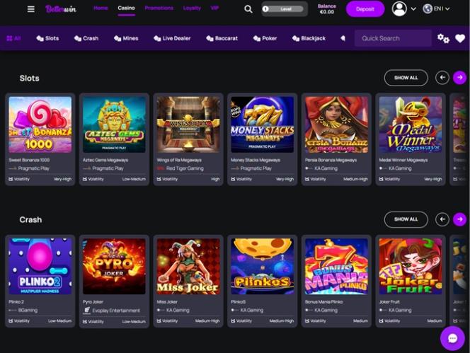 这里有多个引人入胜的类别,包括老虎机、崩溃游戏、地雷游戏、真人荷官游戏、二十一点游戏、骰子游戏、轮盘游戏、龙虎游戏、宾果游戏、刮刮乐游戏、桌面游戏等等。这是一个对加密货币友好的品牌,在这里您可以尝试各种加密货币游戏,并探索其他博彩库,但首先您需要创建一个玩家账户。
