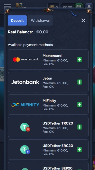 在支付方式方面,玩家可以选择多种支付方式,包括Visa 、 Mastercard 、 Skrill 、 Neteller 、银行电汇、 Paysafecard 、 MiFinity和MuchBetter 。此外,玩家还可以使用多种加密货币进行存款和取款,包括Cardano 、比特币、比特币现金、狗狗币、以太坊、莱特币、 USD Coin 、 Tether和瑞波币。