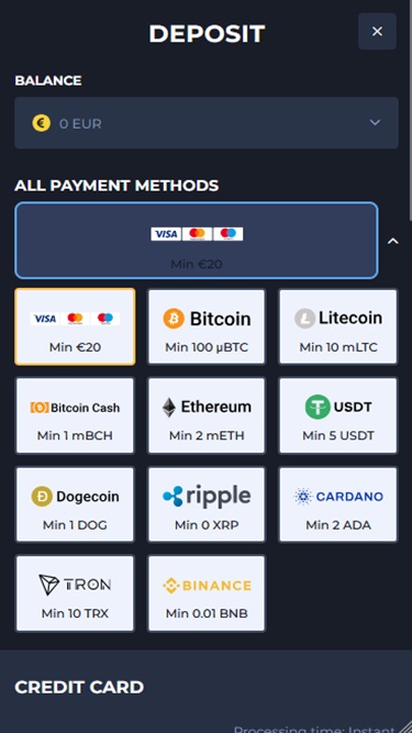 对于喜欢加密支付的玩家,支持Ada、比特币现金、比特币、狗狗币、以太坊、莱特币、TRON、Tether (USDT)、XRP 。