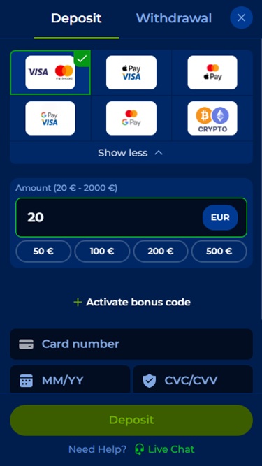 赌场采用深蓝色背景和绿色色调的亮丽配色,拥有直观的用户界面,玩家可以轻松浏览。环境简洁直观,因此您不会被不必要的信息和臃肿内容所淹没,从而避免造成加载时间的延迟。