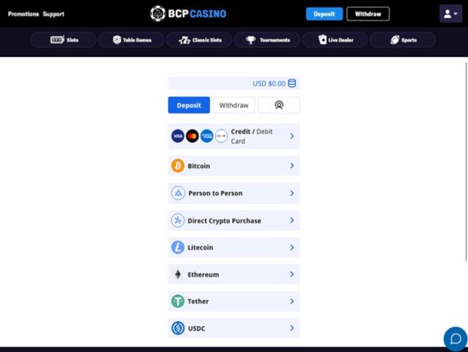 在 Black Chip Poker,您可以使用Visa、MasterCard 和 American Express等热门卡付款,也可以使用支票和在线支付系统等其他传统方式付款。如前所述,该赌场平台还支持加密货币,允许玩家使用比特币、以太坊、莱特币、USDT 和其他数字货币进行交易。