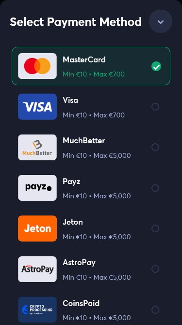 至于银行选项,玩家可以根据自己的喜好使用加密货币存款。除此之外,他们还可以选择使用 Visa、MasterCard、Jeton 等标准支付方式进行存款。我们希望看到玩家拥有丰富的存款选择,并始终赞扬运营商的选择。