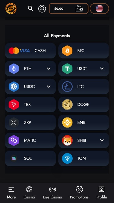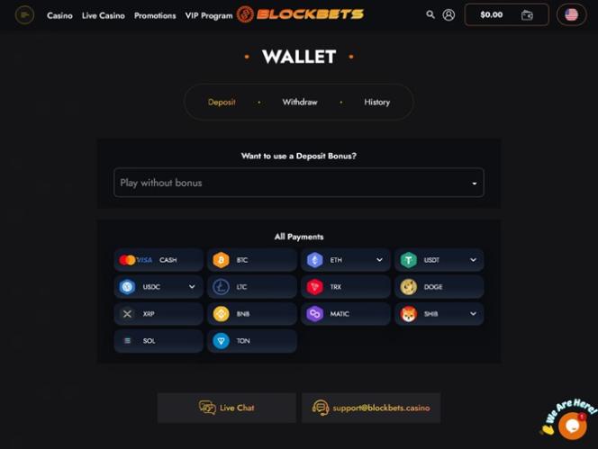 在这里,玩家可以使用信用卡和借记卡等传统银行业务选项,以及Cardano、比特币、狗狗币、Tether、以太坊等加密支付系统和加密货币。