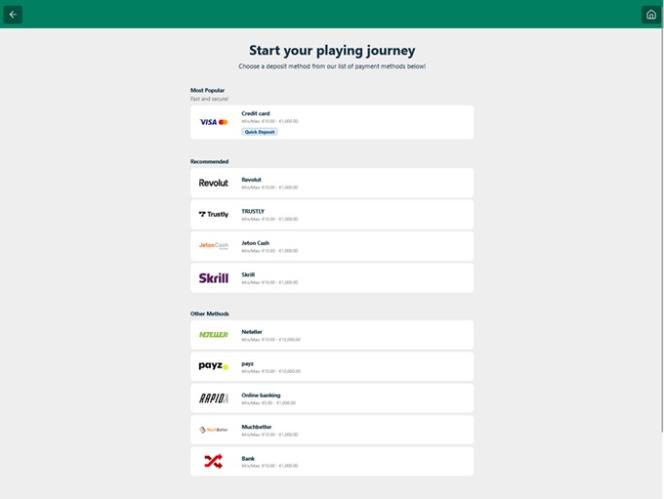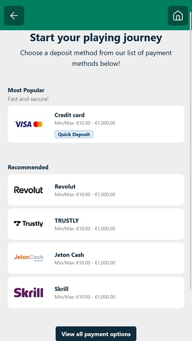 在支付方式方面,您有多种选择来管理您的资金,包括Skrill 、 Neteller 、 Apple Pay 、银行电汇、MuchBetter、 Payz 、Trustly 和Google Pay 。此外,该赌场还接受多种加密货币,包括比特币、比特币现金、以太坊、莱特币、泰达币和瑞波币。
