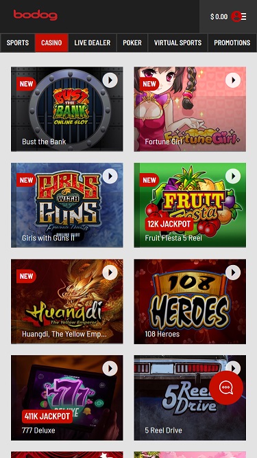 Bodog.com 由 Microgaming, BetSoft, Big Time Gaming, Evolution Gaming, Ezugi, Genesis Gaming, Habanero Systems, lightningboxgames, Oryx, Rabcat, Rival, Wazdan, Realistic Games, Booming Games, Pragmatic Play, Spinomenal, Fantasma Games, Kalamba, Revolver Gaming, Skywind, Spadegaming, Triple Edge Studios, BGAMING, Evoplay, Stormcraft Studios, Pocket Games Soft, All41 Studios, Gameburger Studios, Pulse 8 Studios, Neon Valley Studios, Golden Rock Studios, SpinPlay Games, Qora Games, SmartSoft Gaming, Buck Stakes Entertainment, Games Global, 2by2 Gaming, bluberi, Leander Games, WMS, SG Interactive, Gamomat, Scientific Games, Bally Wulff, Foxium, Zitro, Just For The Win, PearFiction Studios, Wild Streak Gaming, Slingshot Studios, Golden Hero, Fortune Factory Studios, Crazy Tooth Studio, NetGaming, Japan Technicals Games, Snowborn Games, Hacksaw Gaming, Aurum Signature Studios, Area Vegas, 3 Oaks Gaming, Wishbone Games, NextSpin, Spribe, Gaming Corps, Nailed It! Games, Playnova, Atomic Slot Lab, Neko Games, Reel Kingdom, Oros Gaming, Indigo Magic and Light & Wonder提供支持,赌场游戏通过网页界面运行,可直接通过您的网络浏览器加载。该公司的平台运行流畅,易于导航,并且不会占用太多电脑资源。此外,Bodog.com 还支持移动游戏,您可以通过智能手机或平板电脑进行投注。