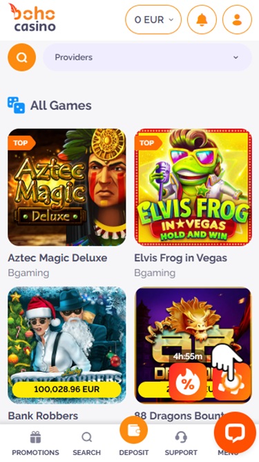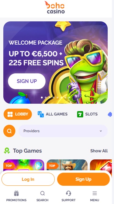 这个博彩品牌拥有一个采用柔和色彩设计的精美平台。界面看似简约,但组织有序,功能齐全。BOHO针对桌面和移动设备进行了优化,无论玩家选择使用哪种设备畅玩自己喜爱的游戏,都能获得良好的游戏体验。