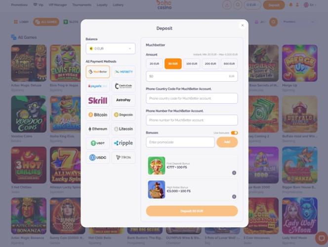 经常访问 BOHO 赌场并参与真钱赌场游戏的玩家,可以兑换每周存款奖金。此外,还有一项针对高额玩家的丰厚奖金。