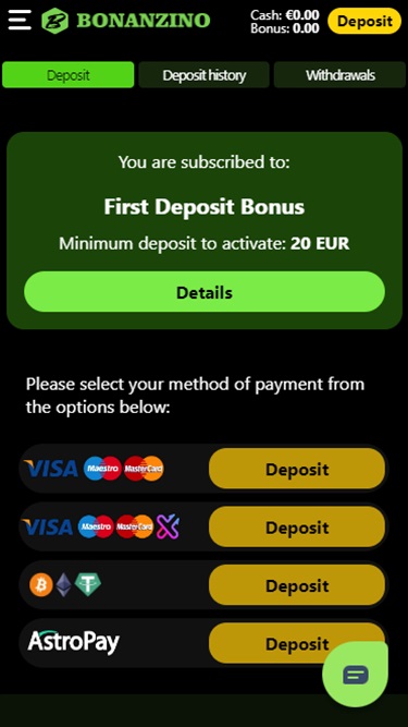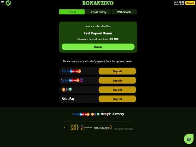 对于交易,玩家可以使用传统的银行选项,如Visa 、 Mastercard 、 Maestro 、 Astropay 、 Flexepin 、 Neteller 、 Neosurf和Paysafecard 。该品牌还接受更安全和匿名的方法,例如比特币、以太坊和Tether等加密货币。