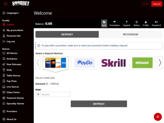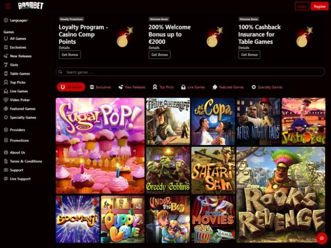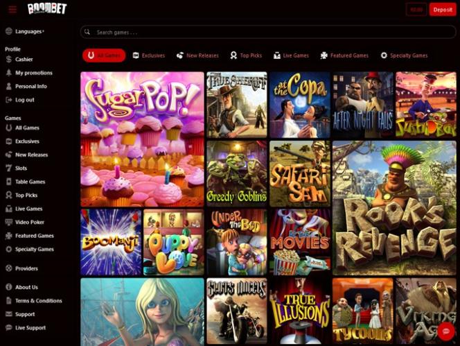 Boombet 由 BetSoft, Genesis Gaming, Rival, Saucify, Arrows Edge, Felix Gaming, Radi8 Games, Fresh Deck Studios, Woohoo Games, Qora Games, SmartSoft Gaming, Tom Horn Gaming, Genii, Dragon Gaming and Dragoon Soft提供支持,赌场游戏通过基于网页的即时游戏平台提供,可直接通过您的网络浏览器加载游戏。赌场还支持移动端游戏,这意味着您可以通过智能手机或平板电脑玩游戏。