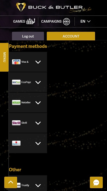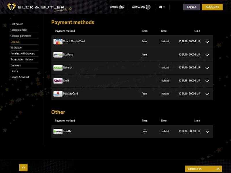 Buck and Butler 由 Microgaming, Net Entertainment, Evolution Gaming, Habanero Systems, iSoftBet, playson, Vivo Gaming, Betgames, Booming Games, IGT, Games Global, omi-gaming, Genii, Spigo and Authentic Gaming提供支持,这为其提供了丰富的游戏库。该赌场通过网页平台进行游戏,这意味着您无需下载任何软件即可畅玩。此外,我们还提供移动网站,方便使用智能手机和平板电脑的用户使用。Baccarat