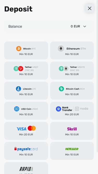 €10 (Crypto/E-wallets)/€20 (Credit/Debit Cards)