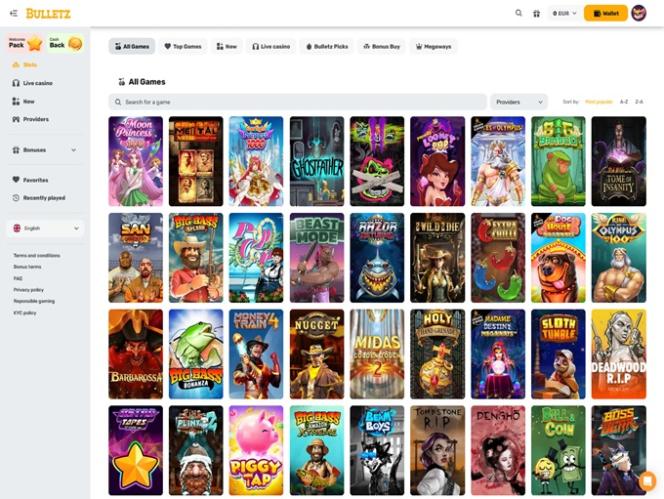 Bulletz 最主要的类别是在线老虎机。运营商提供超过四千款老虎机游戏,玩家可以尝试包括 Megaways、Bonus Buys 等顶级游戏。