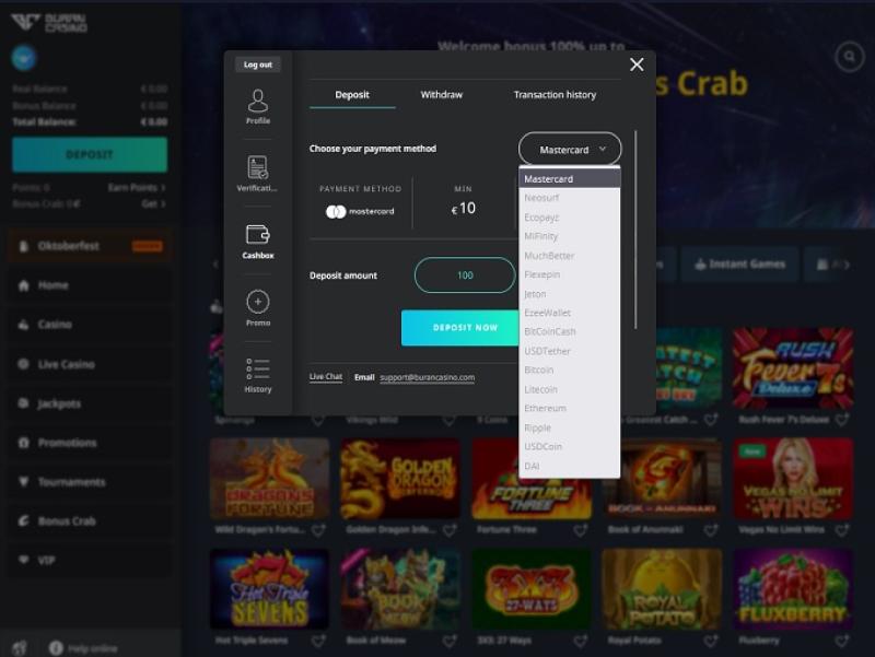 Buran Casino 支持各种值得信赖的支付系统,例如预付卡、借记卡和信用卡、多种电子钱包(包括在某些博彩管辖区流行的电子钱包)、直接转账和加密货币银行业务方法。
