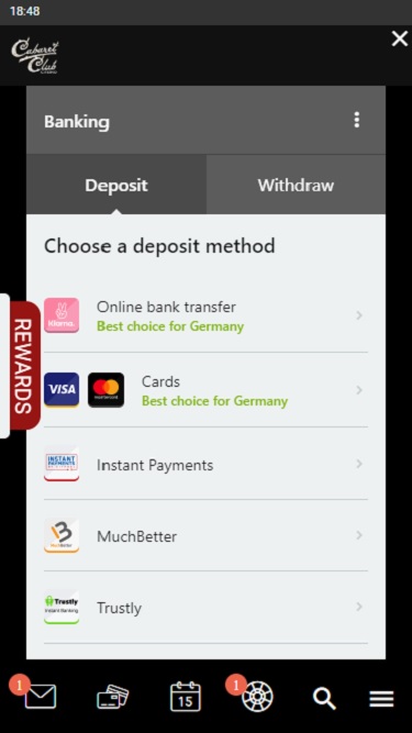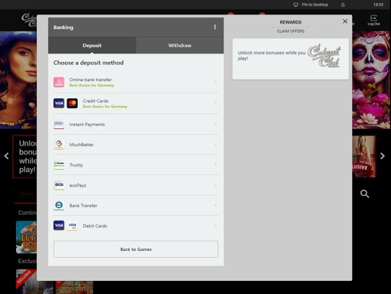 Cabaret Club Casino 由 Microgaming, Net Entertainment, Evolution Gaming, Triple Edge Studios, Stormcraft Studios, Switch Studios, Pulse 8 Studios, Games Global, Just For The Win, Fortune Factory Studios and Half Pixel Studios提供支持,该平台通过其网页平台为玩家提供数百款游戏。无需下载即可畅玩,所有内容均由网站提供。