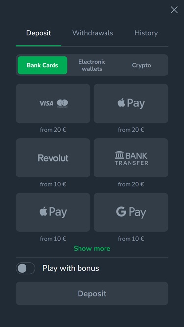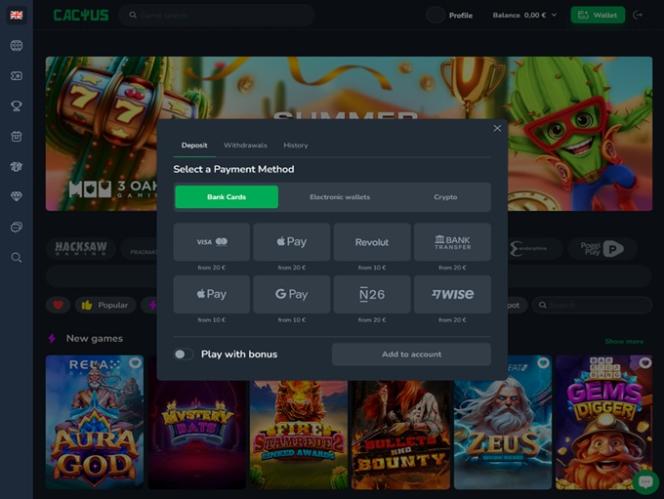 Cactus Casino 接受多种存款和取款支付方式,包括Visa 、 Mastercard 、银行电汇、Apple Pay、 Google Pay 、 Jeton等。此外,您还可以使用多种加密货币管理资金,包括比特币、比特币现金、莱特币、 Toncoin 、 Tron 、 USD Coin和Tether 。