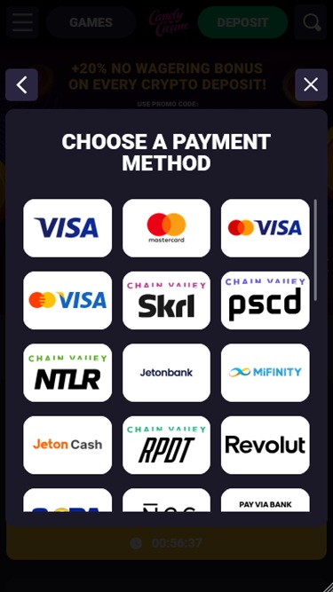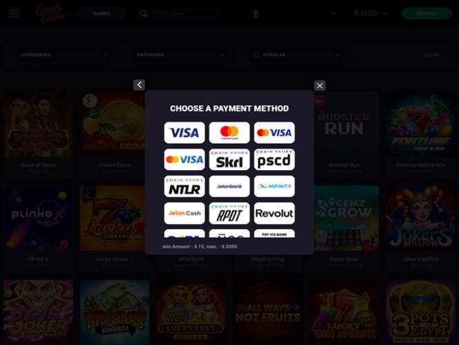 Candy Casino 真正吸引人的地方在于其多样化的支付方式。从 Visa 和 MasterCard 等银行卡,到Skrill 和 Neteller等数字钱包,甚至比特币和以太坊等加密货币,其银行体验都以便捷为设计理念。存款流程顺畅,提款(经验证后)通常在工作日 24 小时内即可处理。