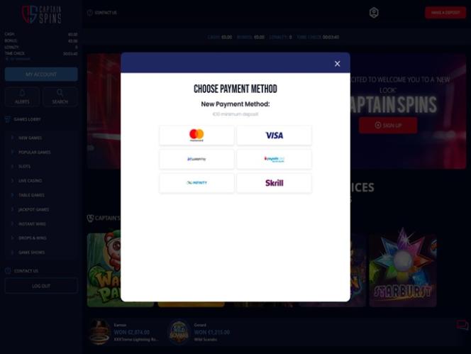Captain Spins 赌场由 Microgaming, Net Entertainment, Evolution Gaming, EYECON, Play'n GO, playson, Rabcat, Relax Gaming, Wazdan, Pragmatic Play, Nolimit City, Red Tiger Gaming, Fantasma Games, Kalamba, Triple Edge Studios, BGAMING, Northern Lights Gaming, Stormcraft Studios, Switch Studios, Electric Elephant Games, All41 Studios, Gameburger Studios, Pulse 8 Studios, Neon Valley Studios, Golden Rock Studios, SpinPlay Games, GONG Gaming, Blue Guru Games, On Air Entertainment, Buck Stakes Entertainment, Games Global, Push Gaming, Inspired Gaming, Old Skool Studios, Foxium, Just For The Win, Storm Gaming Technology, PearFiction Studios, Wild Streak Gaming, Slingshot Studios, Fortune Factory Studios, AvatarUX, Crazy Tooth Studio, ReelPlay, Alchemy Gaming, Snowborn Games, Hacksaw Gaming, Max Win Gaming, SilverBack Gaming, Peter And Sons, Aurum Signature Studios, Area Vegas, Wishbone Games, Spribe, Print Studios, HammerTime Games, Four Leaf Gaming, INO Games, Nailed It! Games, Neko Games, Reel Kingdom and Oros Gaming提供支持,网站使用网页平台与您联系。玩家可以轻松浏览网站,找到他们想玩的游戏。此外,网站还内置移动端支持,方便您在智能手机或平板电脑上畅玩。Baccarat
