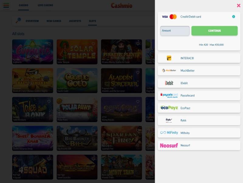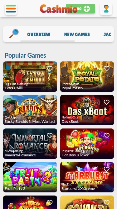 Cashmio Casino 由 Microgaming, Net Entertainment, 1x2gaming, Barcrest, Big Time Gaming, ELK Studios, Evolution Gaming, iSoftBet, lightningboxgames, Play'n GO, Quickspin, Rabcat, Relax Gaming, Thunderkick, Yggdrasil, Endorphina, Pragmatic Play, Nolimit City, Red Tiger Gaming, IGT, SpinPlay Games, Games Global, 2by2 Gaming, Aristocrat, Bally Technologies, Blueprint Gaming, Leander Games, NextGen, NYX Interactive, Push Gaming, WMS, Spigo, Scientific Games, Side City Studios, Authentic Gaming, Foxium, Betdigital, Just For The Win, Slingshot Studios, Crazy Tooth Studio and ReelPlay提供支持,其游戏通过基于网页的即时游戏平台提供,您可以通过互联网浏览器注册、玩游戏和存款。此外,还提供手机游戏,让您可以通过智能手机或平板电脑畅玩海量游戏。