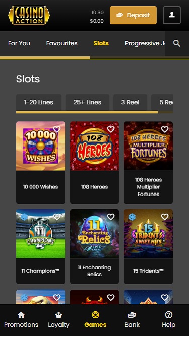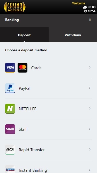 Casino Action 由 Microgaming, Evolution Gaming, Rabcat, Triple Edge Studios, Northern Lights Gaming, Stormcraft Studios, Switch Studios, Electric Elephant Games, All41 Studios, Gameburger Studios, Pulse 8 Studios, Neon Valley Studios, SpinPlay Games, Real Dealer Studios, GONG Gaming, On Air Entertainment, Buck Stakes Entertainment, Games Global, Old Skool Studios, Foxium, Just For The Win, PearFiction Studios, Slingshot Studios, Fortune Factory Studios, Crazy Tooth Studio, Alchemy Gaming, Snowborn Games, Gold Coin Studios, Half Pixel Studios, Eurostar Studios and Aurum Signature Studios提供支持,通过卓越的网页平台提供数百款游戏,该平台可直接通过网页浏览器加载,同时还提供可下载的客户端。该赌场还拥有卓越的移动平台,提供丰富的游戏选择,方便您随时随地畅玩。