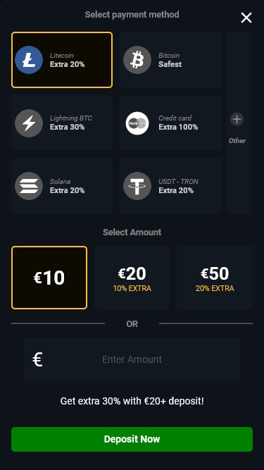 $10 (Crypto)/$15 (Bitcoin)/$30 (Credit/Debit Cards)