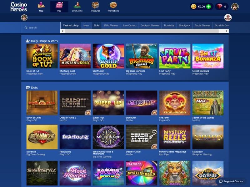 Casino Heroes 由 Microgaming, Net Entertainment, 1x2gaming, Amatic Industries, Barcrest, Big Time Gaming, ELK Studios, Evolution Gaming, Genesis Gaming, iSoftBet, lightningboxgames, Oryx, Play'n GO, playson, Quickspin, Rabcat, Relax Gaming, Thunderkick, Yggdrasil, Wazdan, Realistic Games, Booming Games, Stakelogic, Pragmatic Play, Nolimit City, Red Tiger Gaming, Red Rake Gaming, Skillzzgaming, SYNOT Games, Kalamba, Revolver Gaming, Sigma Gaming, Skywind, Triple Edge Studios, Northern Lights Gaming, Stormcraft Studios, Electric Elephant Games, Pocket Games Soft, Dreamtech Gaming, All41 Studios, Gameburger Studios, Pulse 8 Studios, Neon Valley Studios, Golden Rock Studios, Spearhead Studios, Swintt, TrueLab Games, Shuffle Master, SpinPlay Games, GONG Gaming, Lady Luck Games, Buck Stakes Entertainment, Games Global, Wizard Games, 2by2 Gaming, Blueprint Gaming, NextGen, NYX Interactive, Pariplay, Push Gaming, Inspired Gaming, Gamomat, Scientific Games, Iron Dog Studio, Old Skool Studios, Foxium, Just For The Win, PearFiction Studios, Wild Streak Gaming, Golden Hero, Fortune Factory Studios, Jade Rabbit Gaming, Green Jade Games, STHLM Gaming, 4ThePlayer, AvatarUX, Gamevy, Crazy Tooth Studio, High 5 Games, ReelPlay, Alchemy Gaming, Plank Gaming, BB Games, Snowborn Games, Hacksaw Gaming, Max Win Gaming, Gold Coin Studios, Bang Bang Games, Half Pixel Studios, Arcadem, Slotmill, SilverBack Gaming, Peter And Sons, Aurum Signature Studios, Armadillo Studios and Lucksome Gaming提供支持,该平台通过其网页平台提供种类繁多的游戏。一些玩家批评该赌场某些游戏需要解锁才能进入,而且有些 Boss 战似乎会拖很久。