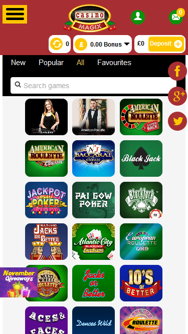 Casino Magix 由 Microgaming, Net Entertainment, EYECON, Genesis Gaming, Thunderkick, Games Global, Wizard Games, Blueprint Gaming, Cozy Games, NextGen and Pariplay提供支持,其游戏通过网页平台提供。此外,还为喜欢通过智能手机或平板电脑玩游戏的用户提供移动网站。Baccarat