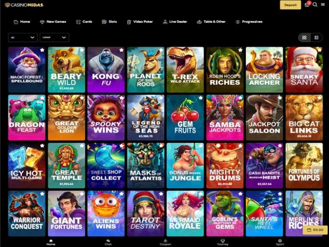 迈达斯赌场 (Casino Midas) 提供众多老虎机游戏,包括数十款视频老虎机和经典老虎机供玩家畅玩。此外,还有一系列提供累积奖金的游戏,奖金金额从数千美元到超过一百万美元不等。