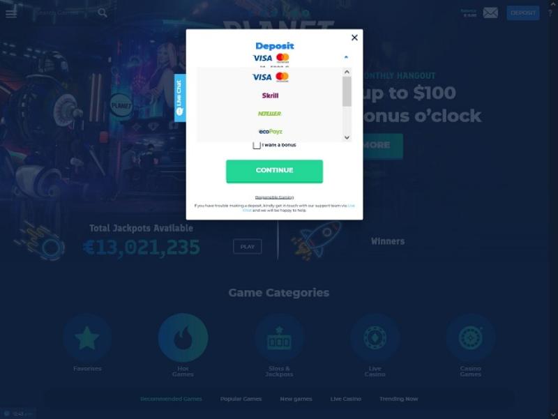 除了标准游戏外,Casino Planet 还拥有完整的真人荷官部分,为玩家提供二十一点、百家乐、轮盘赌等游戏的网络直播版本。