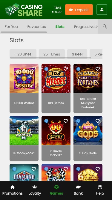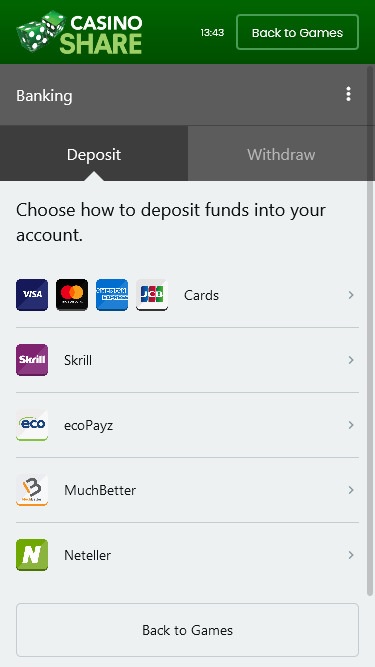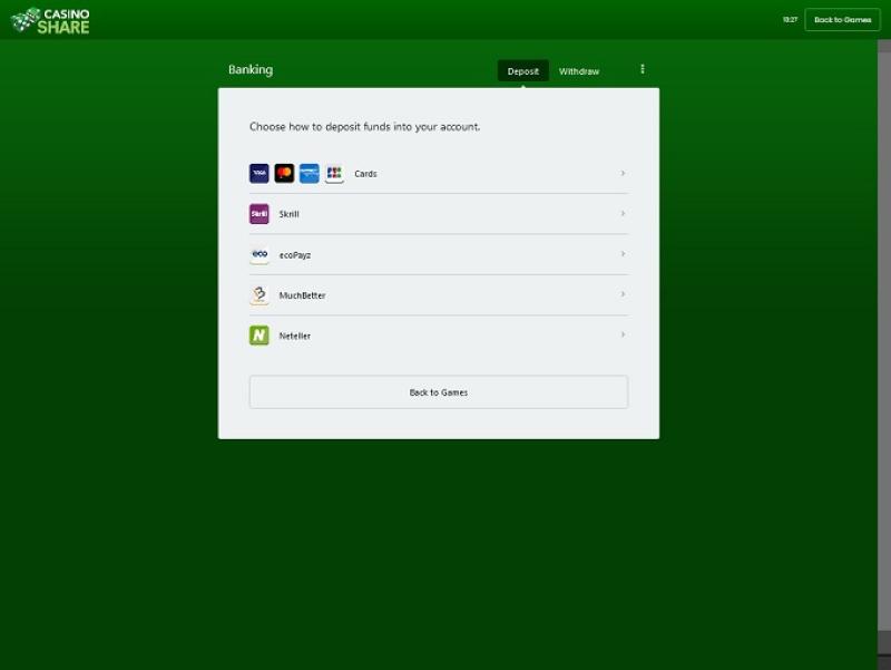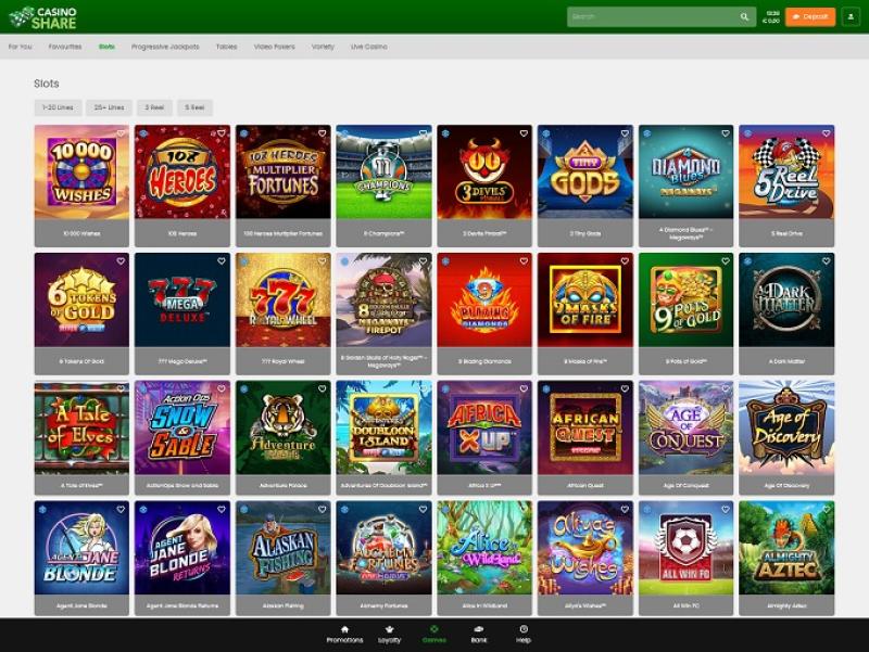 Casino Share 由 Microgaming, Evolution Gaming, Rabcat, Triple Edge Studios, Stormcraft Studios, All41 Studios, Gameburger Studios, Neon Valley Studios, Real Dealer Studios, Games Global, Foxium, Just For The Win and Slingshot Studios提供支持,为玩家提供数百种游戏选择。该赌场拥有卓越的网络平台,玩家无需下载任何软件即可畅玩游戏。Baccarat